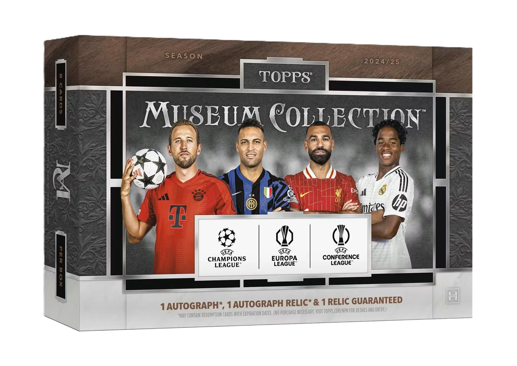 PRODUCT HIGHLIGHTS - This exciting collection features the biggest stars across UEFA Club Competitions! - Collect all 100 Base Cards, featuring the biggest stars and top young players in world football. - Look out for returning autograph cards such as Archival Autographs, Archival Dual Autographs, Framed Autographs as well as on-card Legendary Ink Autographs and the astonishing Supreme Script Autograph Book Card! - Also making a return are Museum Autograph Relics, Archival Dual Autographs, Momentous Material Jumbo Autographs, and Single Player Signature Swatches Dual Relic Autographs. - Autographs. Find the centerpiece to your collection with the Supreme Script Autograph Relic Book Card and theKit-Construction Triple Relics Autograph Book Card. - New for 2024/25: look for Museum Rookie Connection Dual Autograph Relic Cards, Home/Away Dual Relic Autograph Cards, and the instant classic Autographed UEFA Respect/Foundation Patch Book Cards. - Marks of Excellence on-card autos can be found in lucky boxes!
