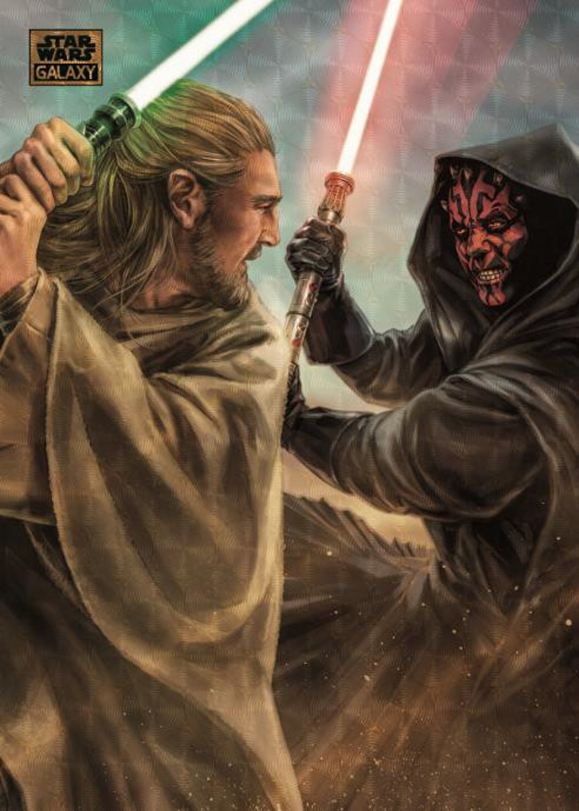 This is a highly anticipated Star Wars product highlighting the classic Galaxy series, and new Star Wars artwork presented on chrome technology. We will be featuring four original art inserts along with top talent autograph signers which fall at one per case. We will also have original art sketch cards, and Blank Canvas Art Cards from Lucasfilm Animators. This product will be celebrating the Anniversary of Star Wars Episode 1: The Phantom Menace, and the Year of the Sith.