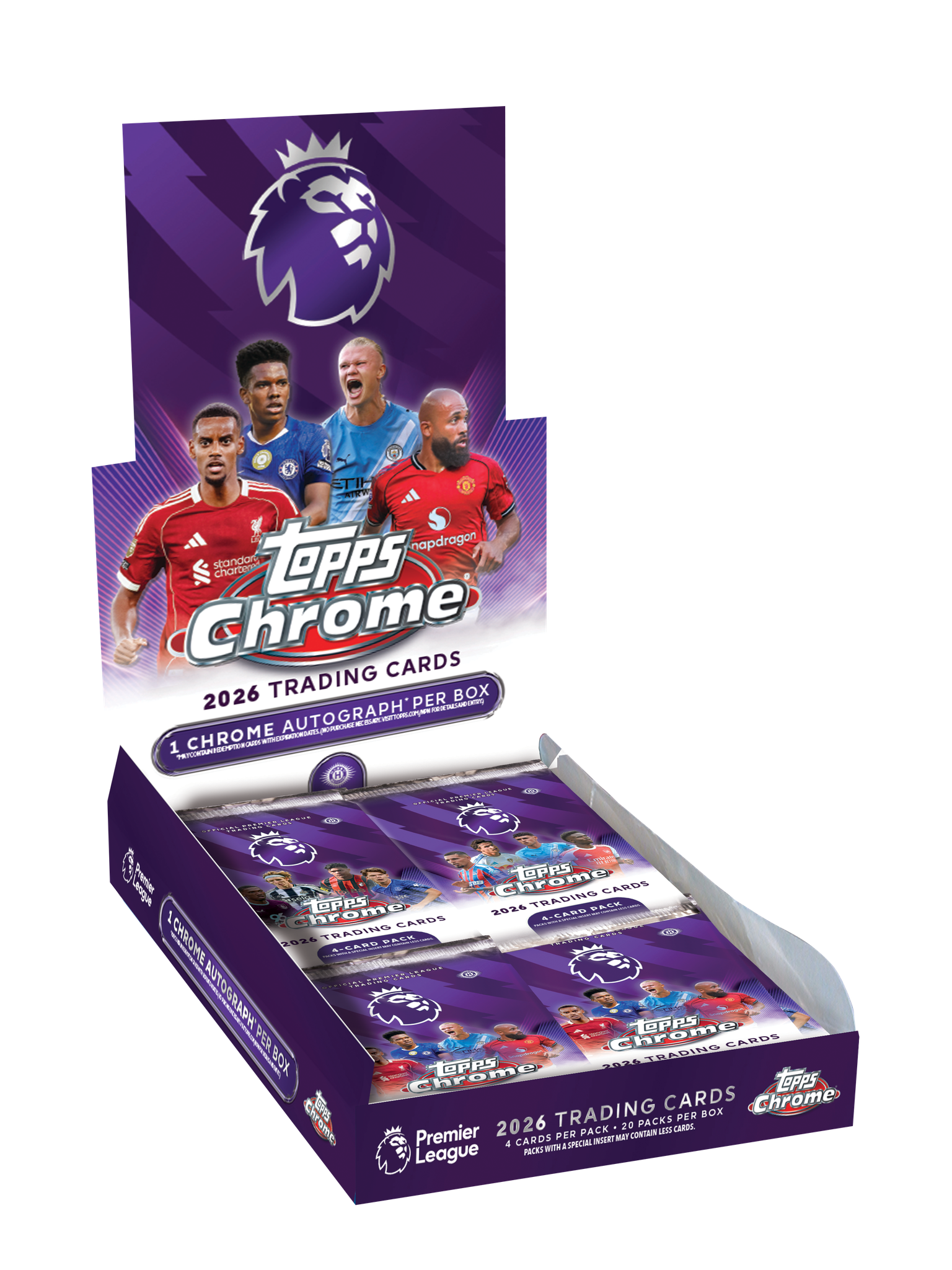 PRODUCT HIGHLIGHTS - Topps Chrome Premier League 2026 brings with it a highly anticipated return, showcasing the Premier League at its Chrome best with a deep autograph checklist, dynamic inserts, and an impressive collection of elite stars! - Build the entire 200-card Base Set across a rainbow of color and tech parallels! - Look for On-Card autographs from the biggest stars including Mohamed Salah, Thierry Henry, and Wayne Rooney. Find rookie autographs of Max Dowman, Rio Ngumoha, and Estêvão Willian!